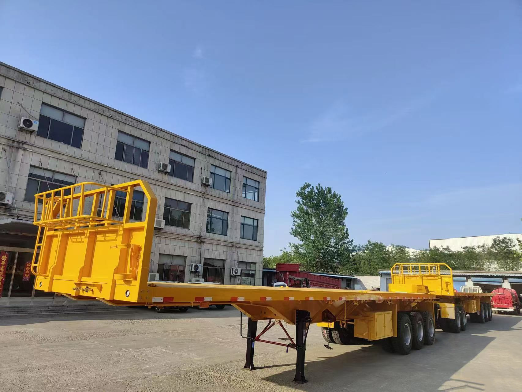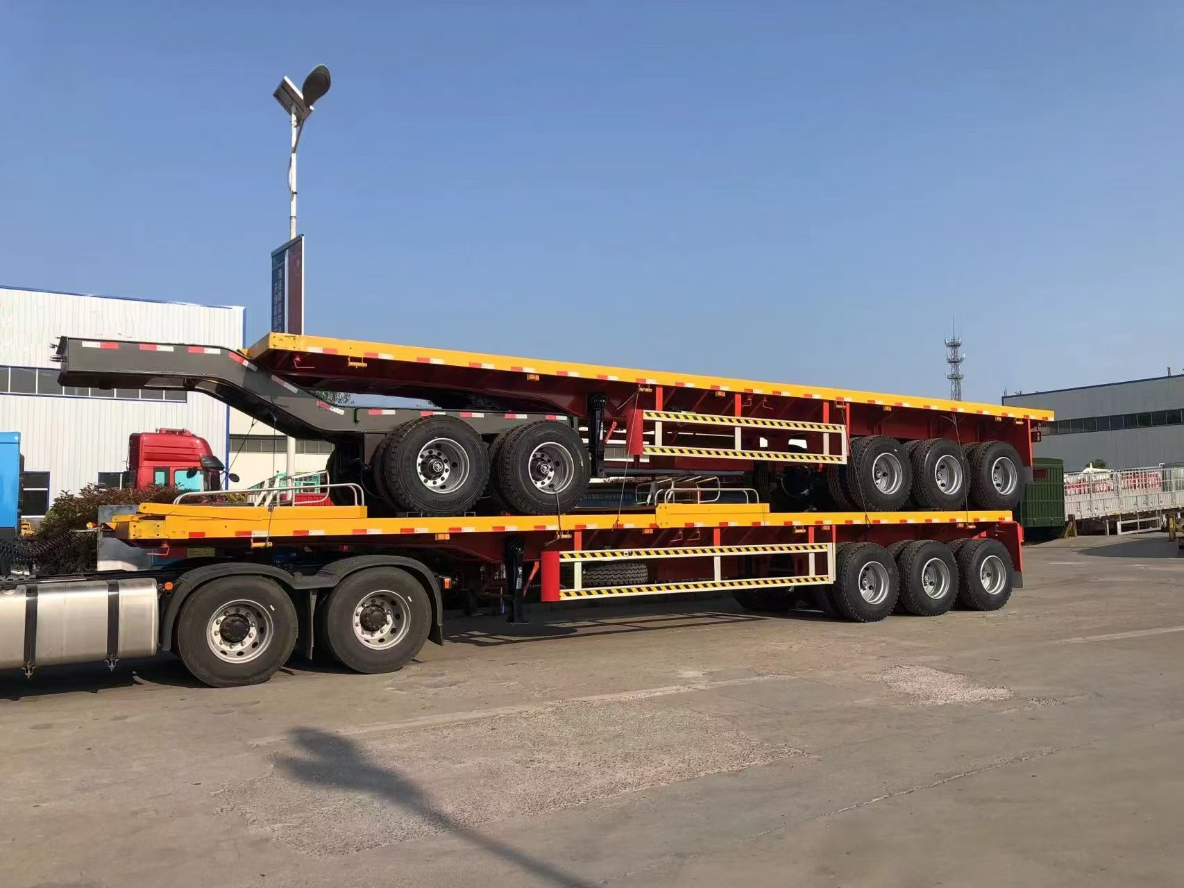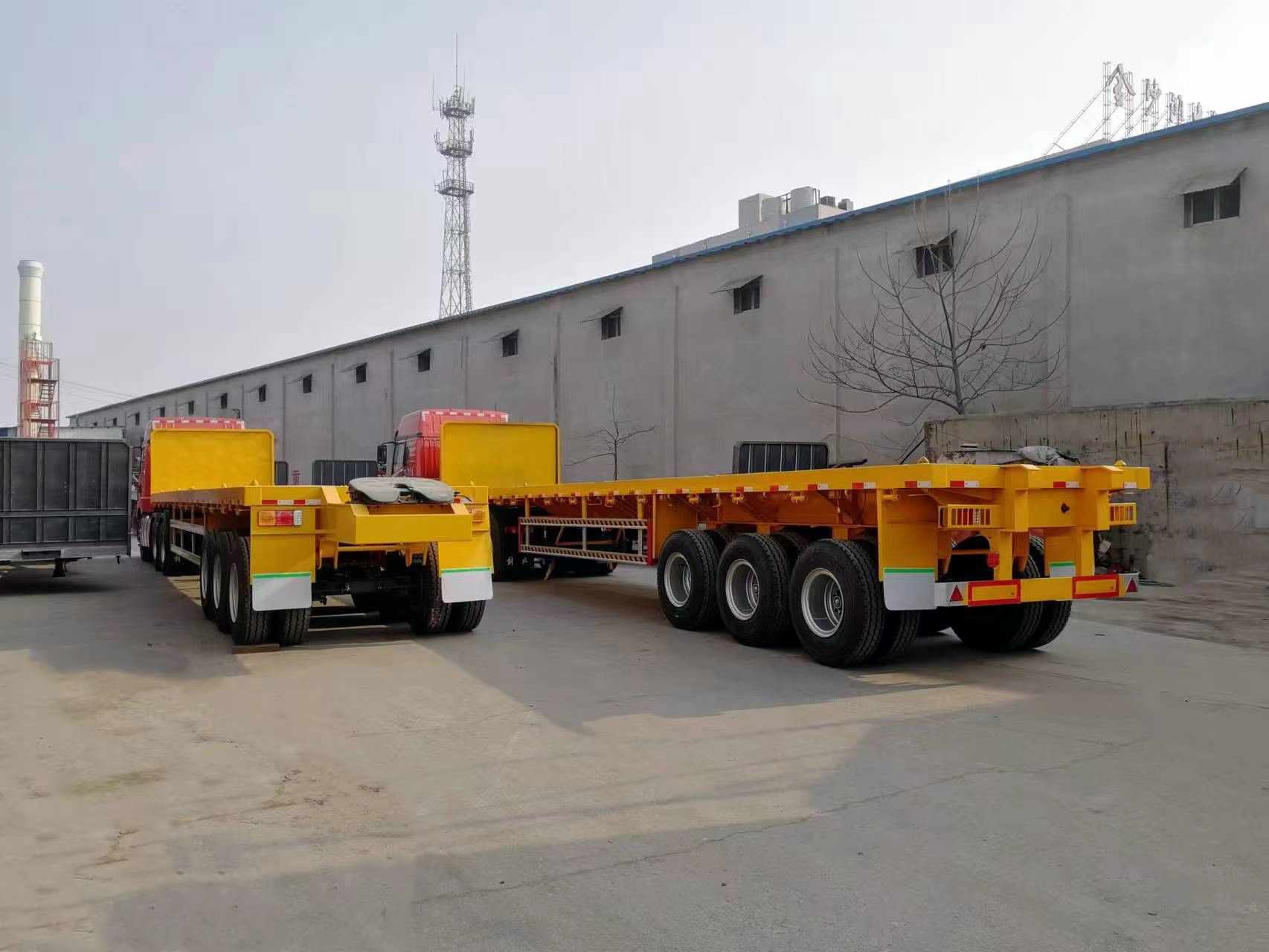 The 40 FT and 40 FT Interlink Flat Deck Trailer design idea from the train. It mostly same to the 20 FT and 40 FT interlink flat deck trailer. It can transport four 20 FT containers or two 40 FT containers together.  More heavy duty capacity and larger volume.  It is widely use for coaling , building material, Grain transportation. The interlink design trailer is very popular because the high efficient and large volume transportation on one transportation trip.