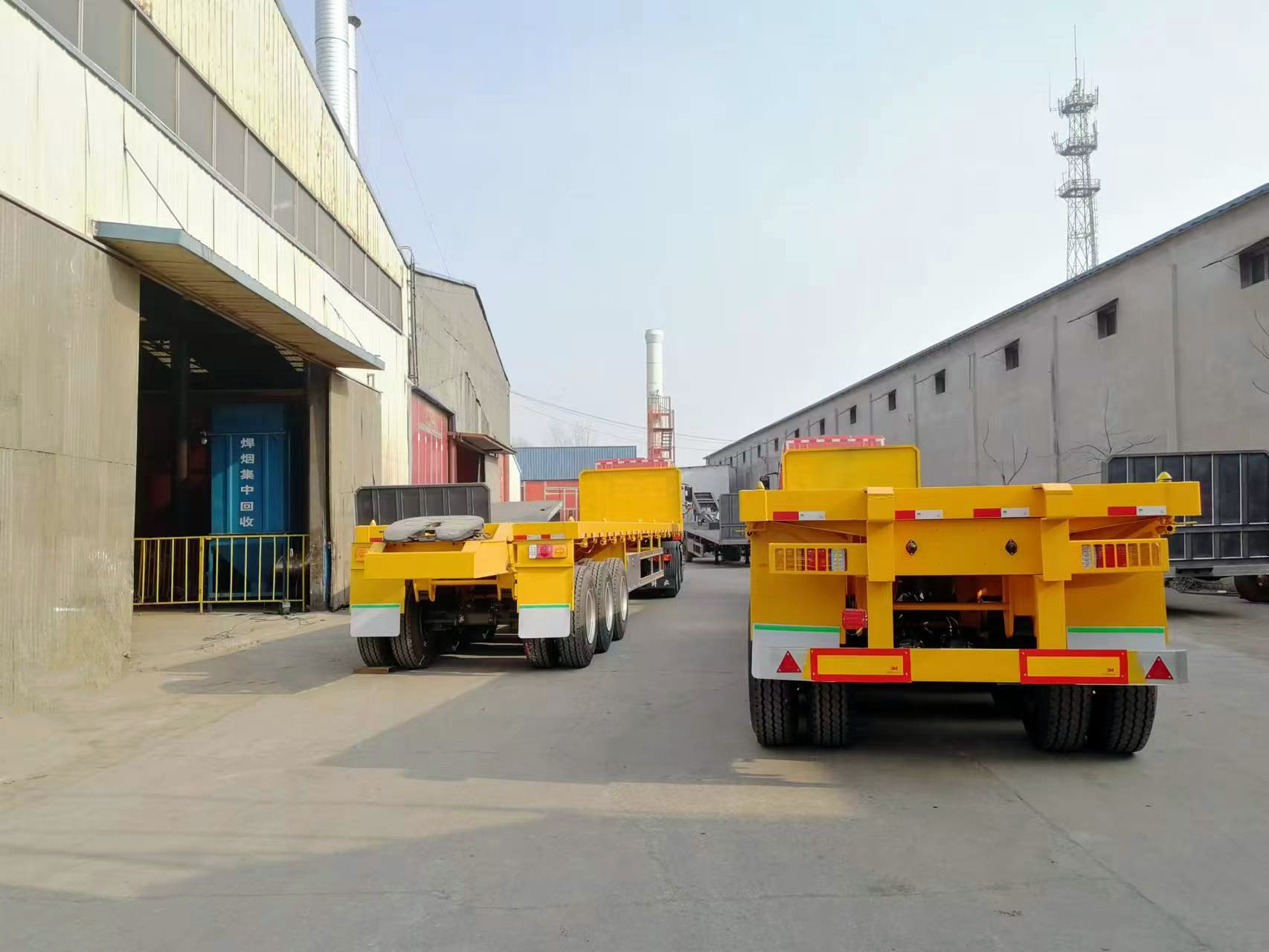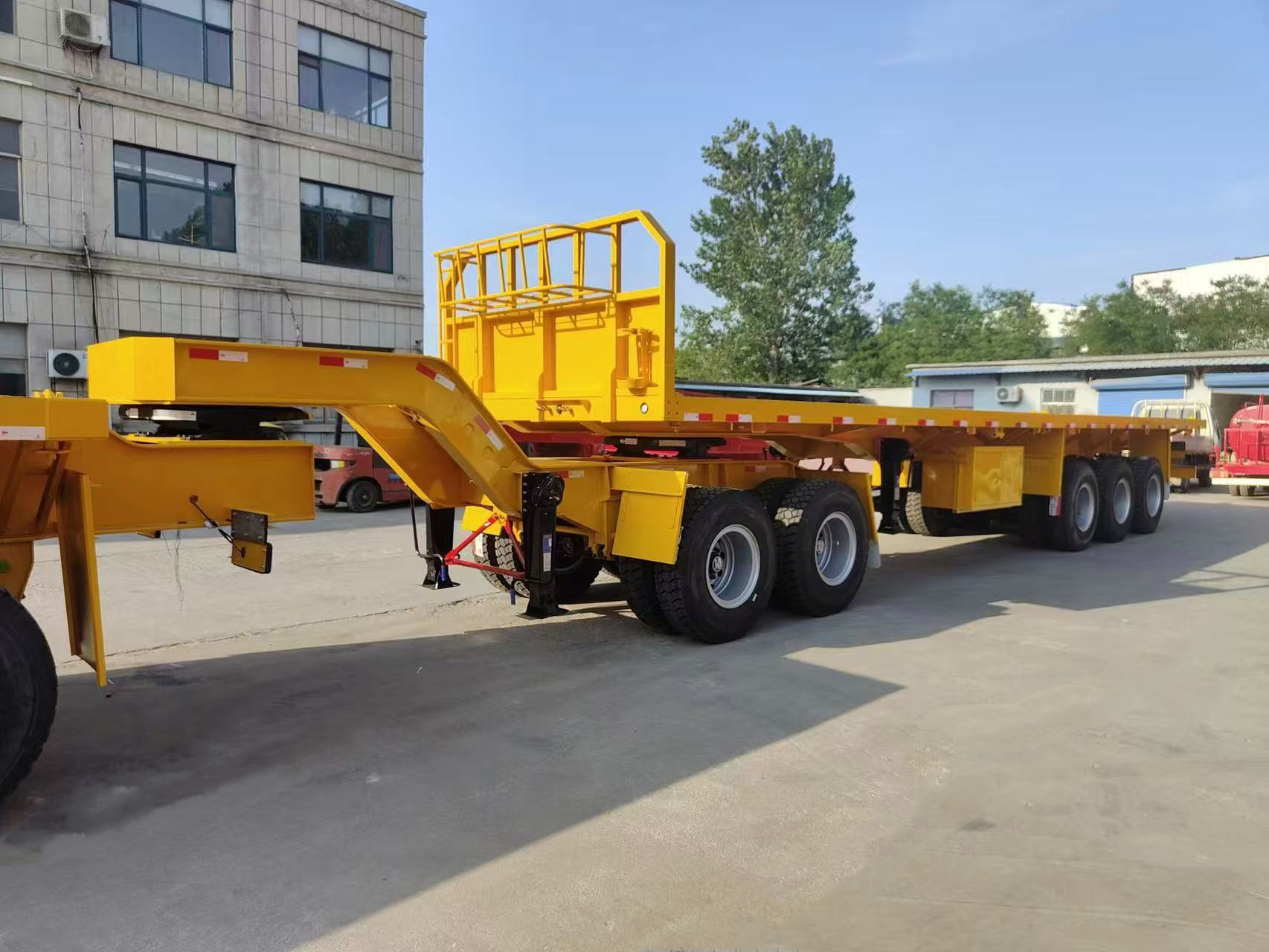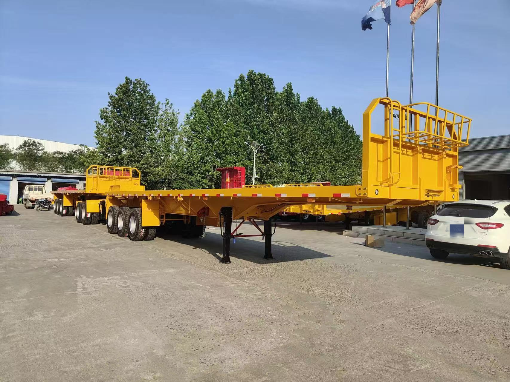 The 40 FT and 40 FT Interlink Flat Deck Trailer design idea from the train. It mostly same to the 20 FT and 40 FT interlink flat deck trailer. It can transport four 20 FT containers or two 40 FT containers together.  More heavy duty capacity and larger volume.  It is widely use for coaling , building material, Grain transportation. The interlink design trailer is very popular because the high efficient and large volume transportation on one transportation trip.