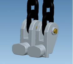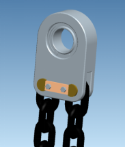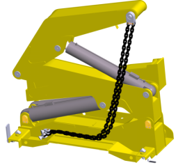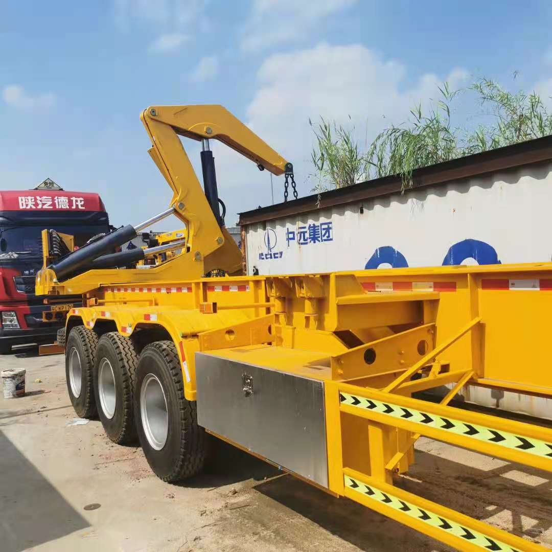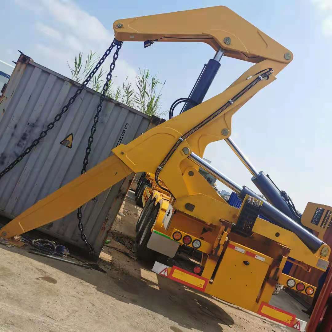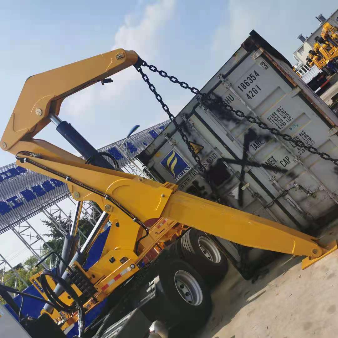 The chain hook locking mechanism for container handling. During container loading, the locking mechanism rotates automatically within the corner fittings of the container and locks securely, ensuring safety during the operation; during transportation, the locking mechanism can still automatically lock through the limit device, eliminating the repetitive actions of operators for re-securing the chain during transportation and unloading, and significantly enhancing the safety during vehicle movement; after the operation is completed, by optimizing the movement trajectory of the lifting points and the position of the chain retrieval, the automatic storage of the chain during the lifting arm’s retraction is achieved, greatly improving the comfort of operation and the safety of the entire vehicle.